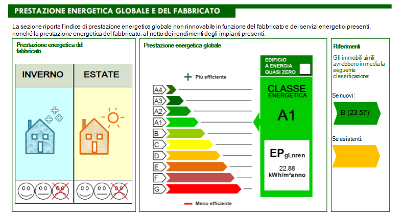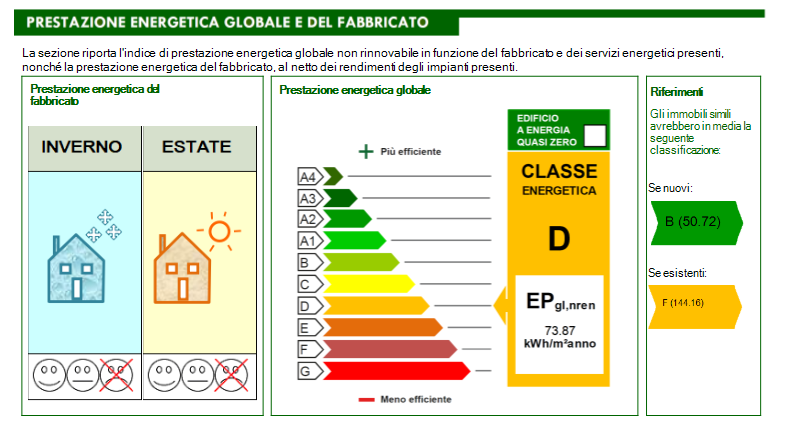 La sezione “PRESTAZIONE ENERGETICA GLOBALE E DEL FABBRICATO” dell’APE (riquadro “Riferimenti”) prevede due comparazioni fondamentali per la classificazione energetica dell’immobile oggetto di analisi: