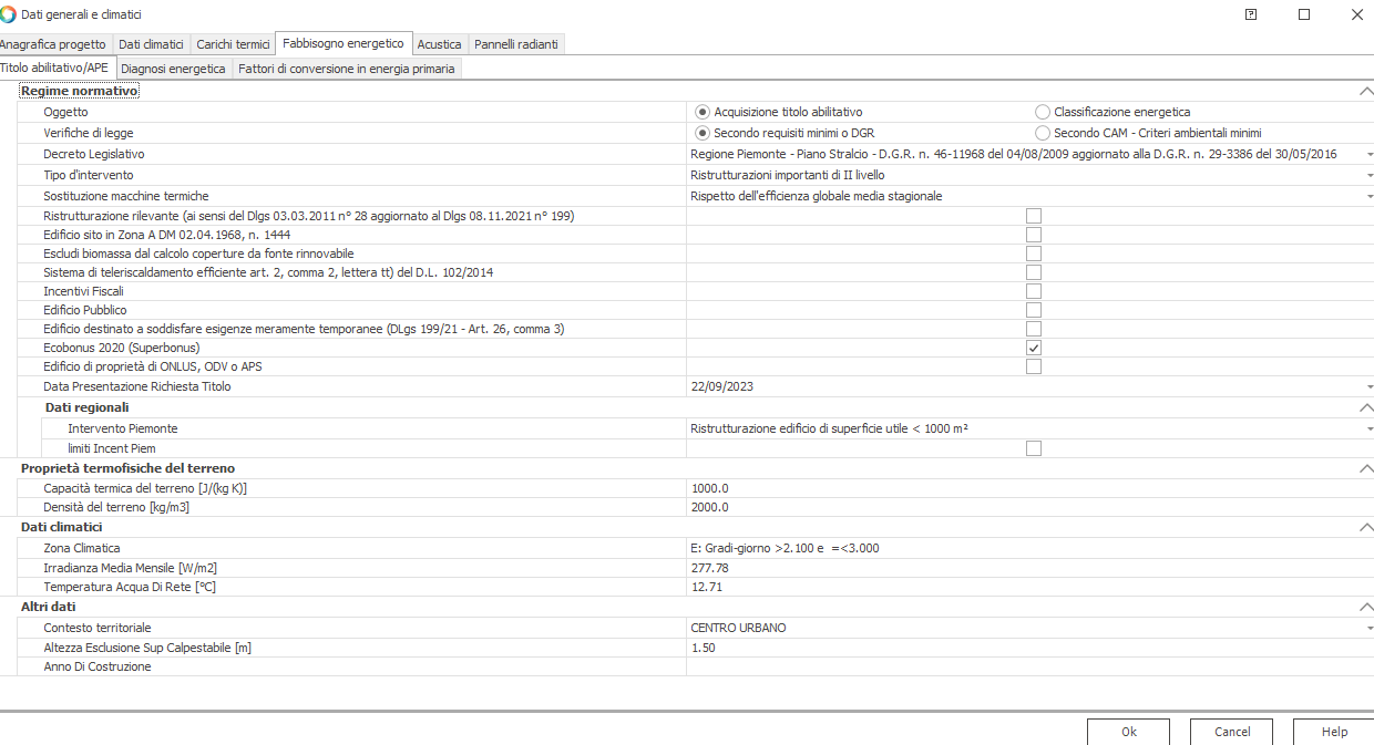 N.B.: tali valori vengono assunti selezionando l’opzione “Ecobonus 2020 (Superbonus)”presente all’interno della maschera dei Dati di progetto, sezione “Fabbisogno energetico edificio”. Se viene caricato un file per cui sia stata già selezionata in precedenza l’opzione “Superbonus” all’interno del modulo di Diagnosi energetica, essa viene automaticamente acquisita anche nei Dati di progetto.