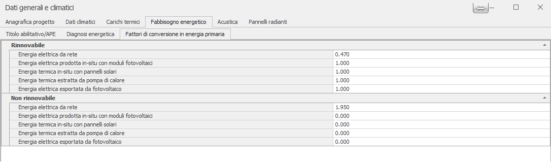 La maschera elenca i fattori di conversione in energia primaria rinnovabile (fp,ren) e di conversione in energia primaria non rinnovabile (fp,nren) di alcuni dei vettori energetici implicati nel calcolo; la tabella consente la modifica manuale dei valori in modo da poterli aggiornare, in tempo reale, qualora ne ricorresse il caso in concomitanza con l'emanazione di nuovi decreti legislativi o raccomandazioni tecniche degli enti competenti.