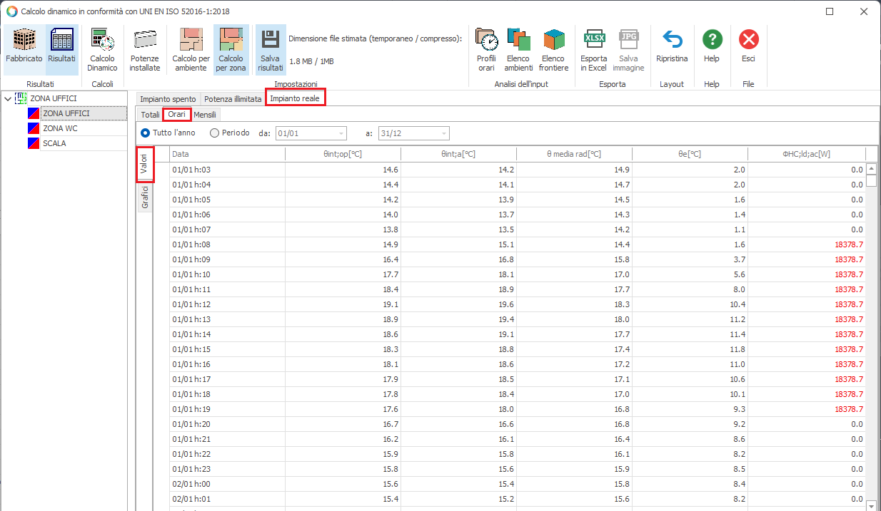 ed in seconda istanza come valori "Orari" in termini di : Θe = temperatura esterna [°C] Θmedia,rad = temperatura media radiante [°C] Θint,a = temperatura dell'aria interna [°C] Θint,op = temperatura operante interna [°C] ΦH,C,ld,ac = potenza da fornire in riscaldamento o da asportare in raffrescamento [W]