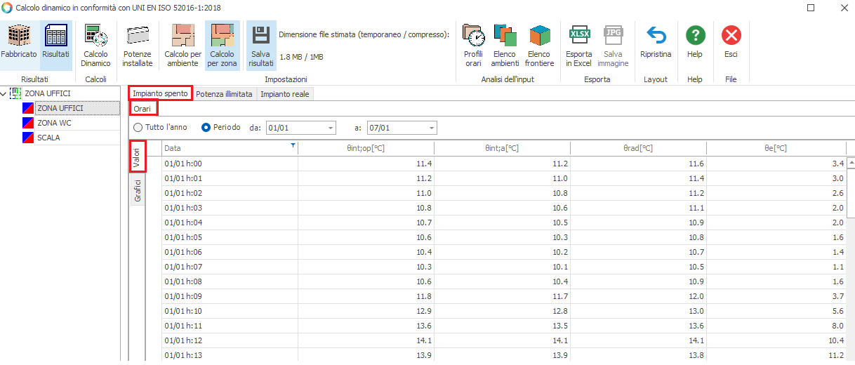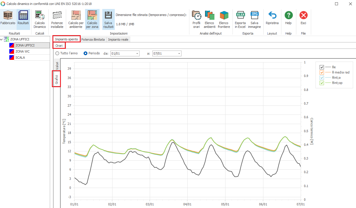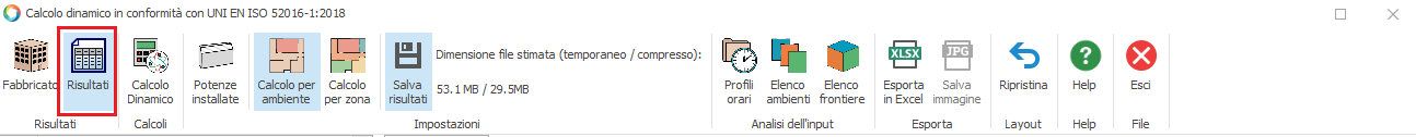 La sezione "Risultati" è suddivisa in tre sezioni che rispecchiano le tre logiche previste dalla norma per la determinazione del carico termico e del fabbisogno “ideale” di riscaldamento e raffrescamento: - Impianto spento, finalizzata alla stima della temperatura operativa in assenza di impianto - Potenza illimitata , finalizzata alla valutazione dell’utilizzabilità dell’impianto (le cui specifiche non sono note); in questo caso si presuppongono il funzionamento continuo dell’impianto, nessuna limitazione alla potenza (“evoluzione libera del sistema”), perdite di energia non recuperabili ed emissione termica esclusivamente convettiva; - Potenza disponibile, finalizzata, in presenza di un impianto di caratteristiche note, alla valutazione degli effetti di una sua specifica gestione; in questo caso si presuppongono il funzionamento discontinuo dell’impianto,potenza limitata a quella disponibile, perdite di energia recuperabili ed emissione termica sia convettiva che radiativa.