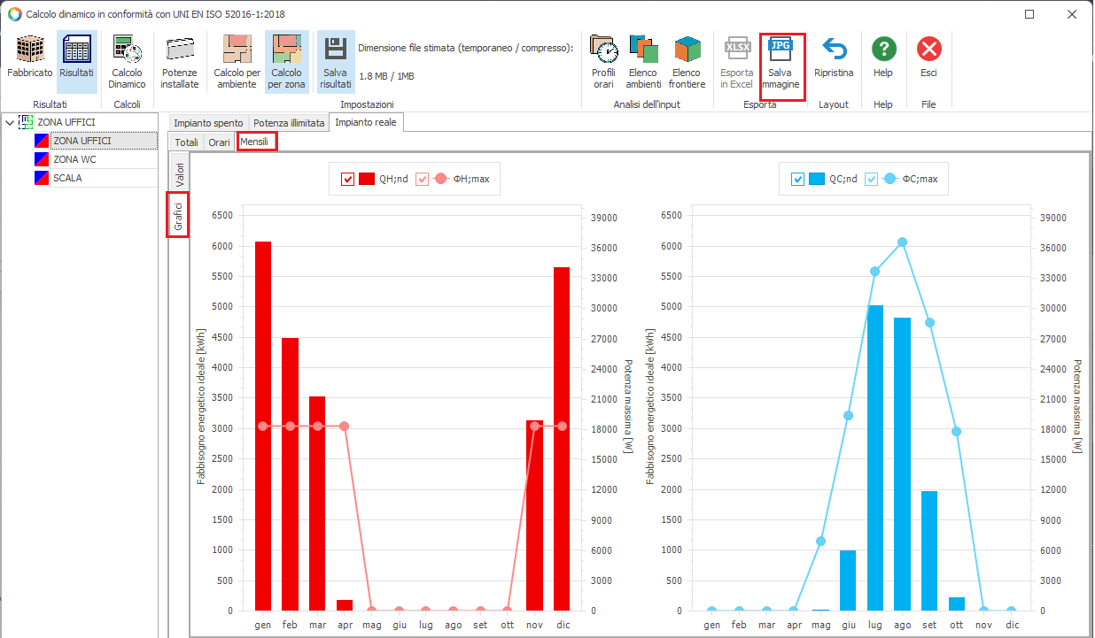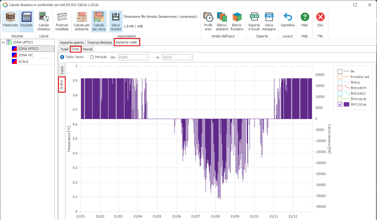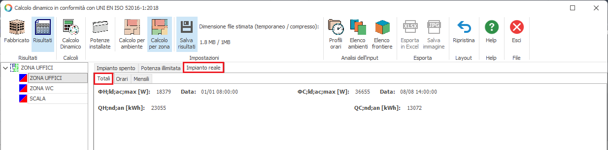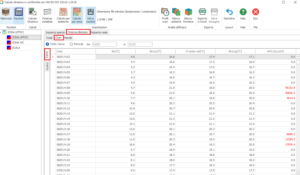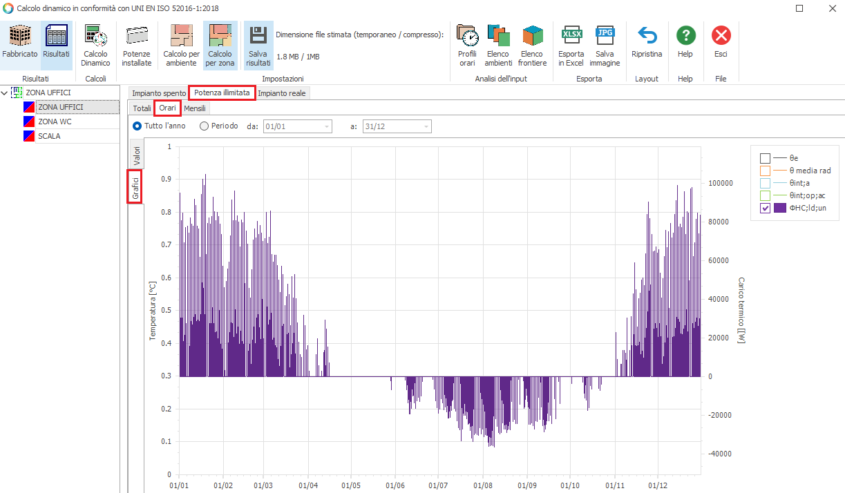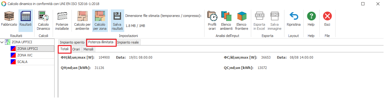 Nell’ambito del calcolo con potenza "illimitata" la valutazione prescinde da scelte specifiche riguardanti gli impianti tecnici e si presuppone la presenza di un generatore “ideale” in grado di soddisfare l'intero carico termico richiesto dall'involucro edilizio; si assume, in particolare, che l’impianto operi in regime continuo, che le perdite di energia termica siano recuperabili e che il calore fornito sia di tipo puramente convettivo. I risultati sono presentati in prima istanza come valori "Totali" ovvero in termini di : - ΦH,ld,un, max = massima potenza invernale richiesta (per zona od ambiente) [W] e relativi ora/giorno/mese di raggiungimento - ΦC,ld,un, max = massima potenza estiva richiesta (per zona od ambiente) [W] e relativi ora/giorno/mese di raggiungimento - QH,nd,an = fabbisogno di energia utile per riscaldamento relativo all'intera stagione [kWh] - QC,nd,an = fabbisogno di energia utile per raffrescamento relativo all'intera stagione [kWh]