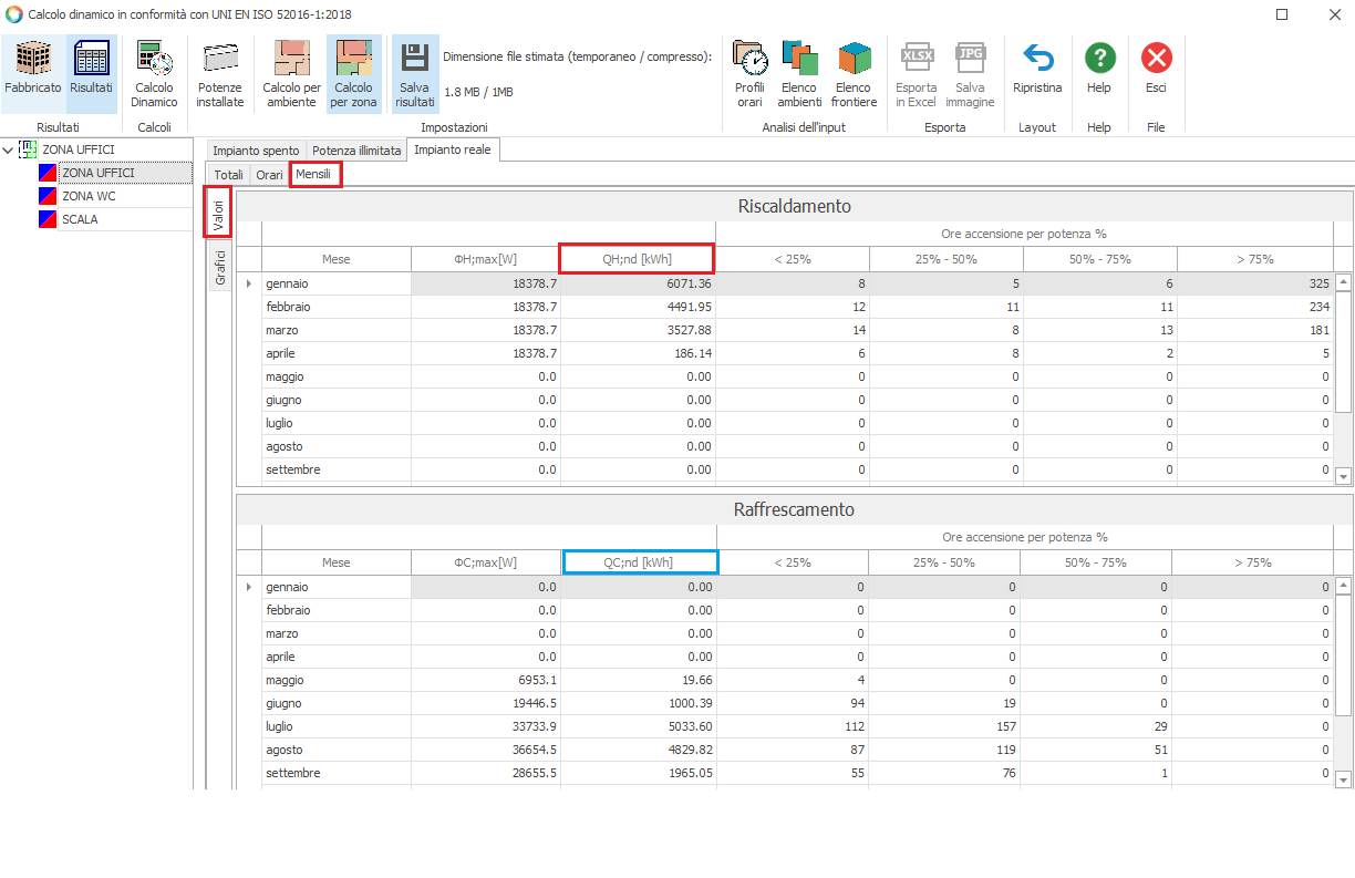 Risultati di calcolo in termini di energia mensileIn riferimento ai soli calcoli con impianto a potenza illimitata e potenza reale, oltre ai valori di potenza, sono restituiti i valori di fabbisogno energetico mensile, corrispondenti all'aggregazione dei valori di potenza oraria di tutti i giorni del mese . I valori di energia si riferiscono ai fabbisogni di energia utile ideale dell'involucro; essi sono consultabili nella sezione "Mensili - Valori" dei Risultati di calcolo: nella colonna QH,nd [kWh] è indicato il fabbisogno invernale mentre nella colonna QC,nd [kWh] il fabbisogno estivo. Le colonne "Ore accensione per potenza" indicano la percentuale di ore di accensione dell'impianto nelle fasce di potenza inferiore al 25 % della potenza massima, compresa tra il 25 ed il 50 % della potenza massima, compresa tra il 50 ed il 75 % della potenza massima e al di sopra del 75% della potenza massima.