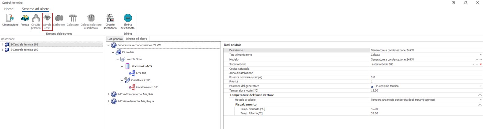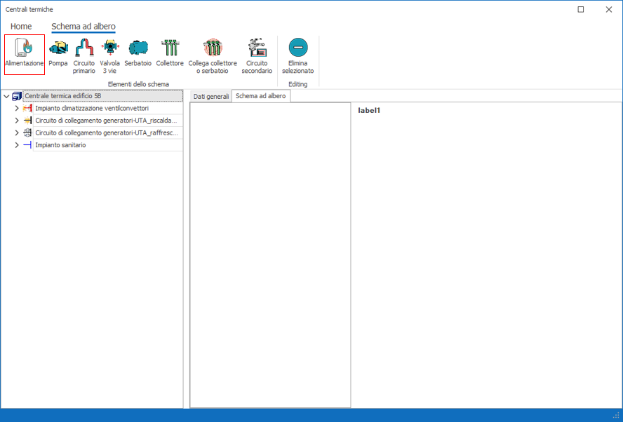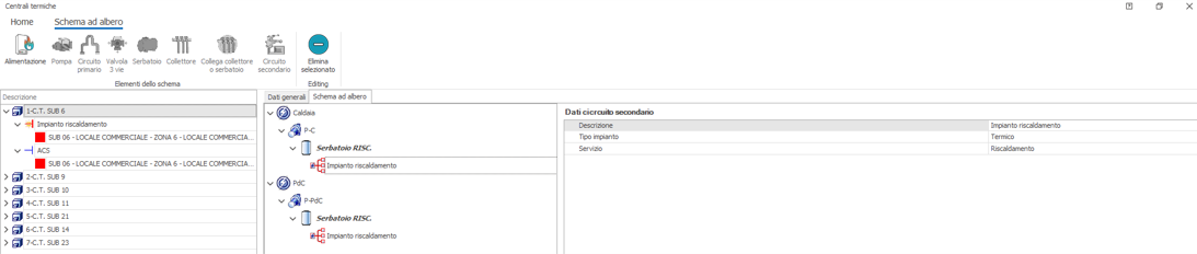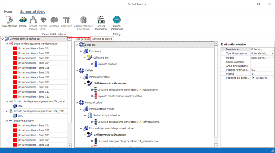 Scheda Componenti - Schema ad AlberoLo schema ad albero mostrato in figura qui in basso contiene tutti i componenti della Centrale Termica dal/i Generatore/i alla rete di distribuzione.