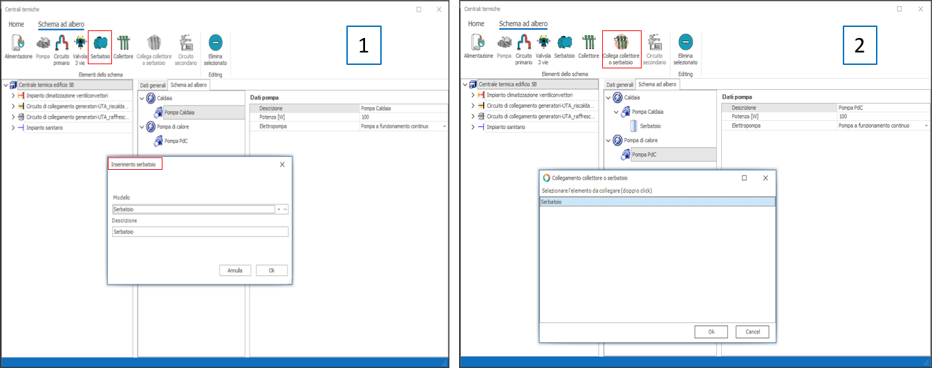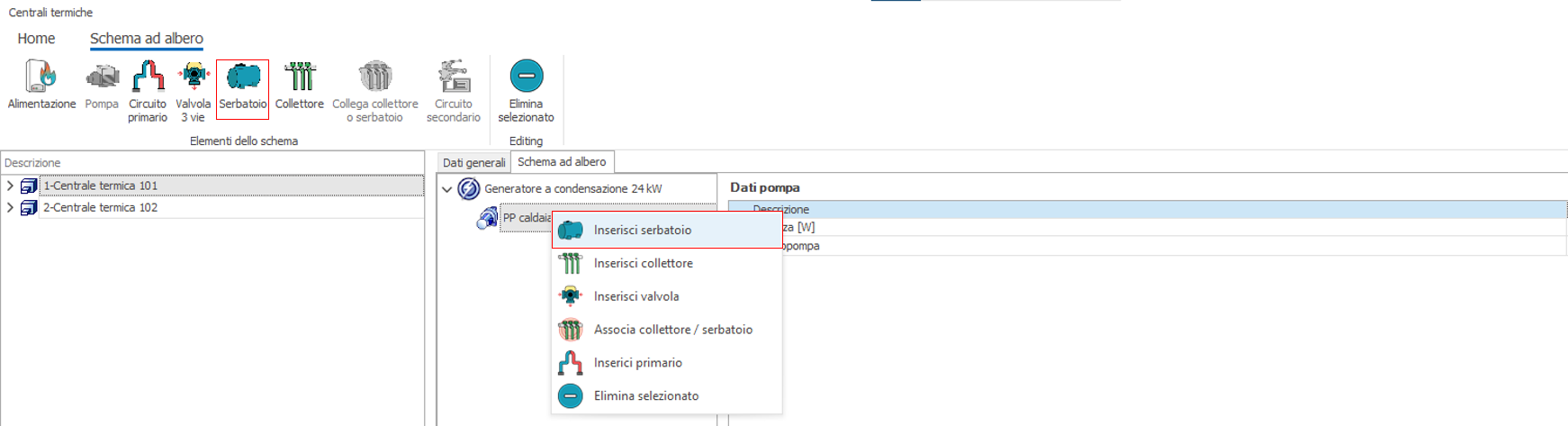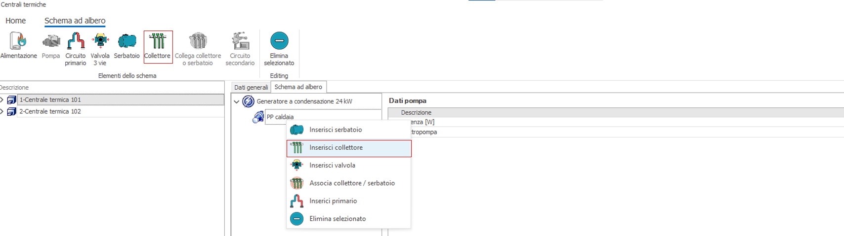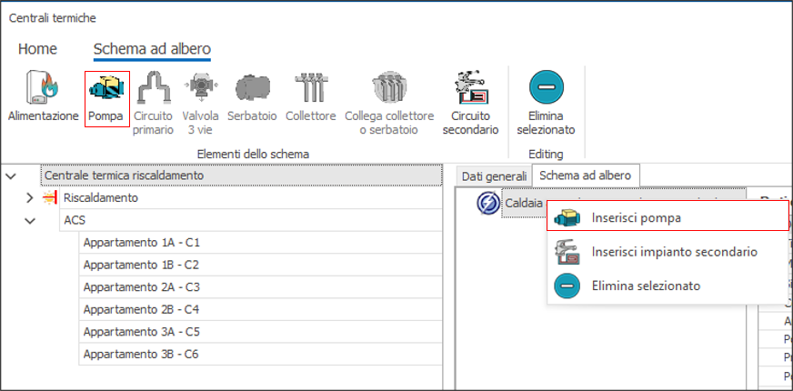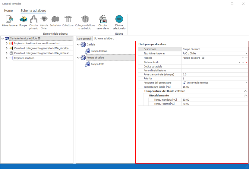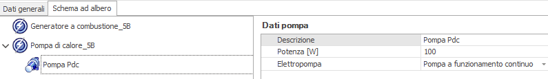 1. Descrizione: inserire una descrizione della pompa 2. Tipo di funzionamento: due le opzioni possibili: 1) Pompa a velocità costante e 2) Pompa a velocità variabile. Nel caso 2) l'assorbimento della pompa è moltiplicato per il Fattore di Carico FC delle generatore altrimenti il funzionamento è continuo. 3. Wpo: potenza elettrica in W assorbita dal circolatore. Qualora la pompa non esistesse nella distribuzione reale basta impostare questo dato a zero e dal punto di vista energetico tale componente non verrà pressa in considerazione. Una volta inserito il componente è possibile editarne le proprietà nella sezione a destra della scheda, una volta che il componente è stato selezionato. Nel nostro esempio inseriamo una pompa per entrambi i generatori. Il risultato ottenuto è il seguente: