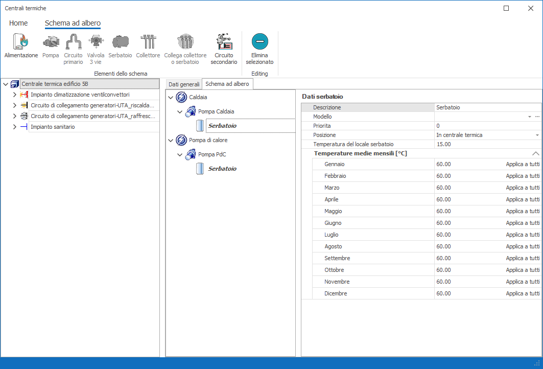 Le tipologie di impianto sono tre: - Termico: l'utente deve selezionare questa opzione per impianti di riscaldamento e raffrescamento. La tipologia dovrà essere specificata come tra le proprietà dell'impianto stesso. - Idrico Sanitario: occorre selezionare questa tipologia di impianto per indicare il servizio ACS al generatore da cui questo impianto prende il fuido vettore - Raffrescamento: è la tipologia di impianto al quale associare una Unità di Trattamento Aria e definisce la distribuzione del circuito acqua (il circuito aria si definisce direttamente sull'oggetto UTA) Il secondo comando Seleziona Impianto Esistente, invece permette la selezione di un impianto già precedentemente definito. Il programma apre una maschera con la lista degli impianti selezionabili. Nel caso in cui l'utente abbia inserito graficamente un impianto di distribuzione occorre utilizzare tale comando per far si che la tabella con la lista delle tubazioni venga completata automaticamente con quanto inserito nell'input grafico (calcolo analitico del rendimento di distribuzione). Nel nostro esempio aggiungiamo un impianto termico cui poi assegneremo tutte le zone dei vari alloggi (impianto centralizzato). Lo schema pertanto sarà quello mostrato nella figura sottostante. Aggiungendo un impianto al serbatoio riscaldamento alimentato dalla PdC il programma automaticamente lo aggiunge sia al ramo Caldaia essendo il serbatoio il medesimo. Allo stesso tempo il programma aggiunge l'oggetto impianto nella barra a sinistra subito sotto la centrale termica CT.
