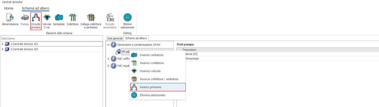 In tal modo appare il menu contestuale nell'ambito del quale si dovrà selezionare la voce: Aggiungi Pompa circuito primario. Il medesimo menu consente di procedere alla rimozione del generatore o all'aggiunta di un altro generatore. Selezionando l'opzione Aggiungi Pompa Circuito Primario il programma mostra il dialogue box dove inserire i dati per il calcolo:
