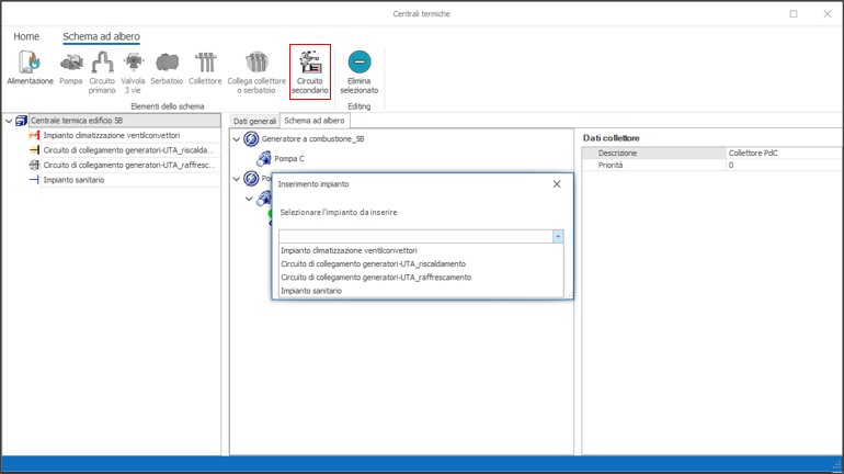 Nelle proprietà dell' elemento Circuito primario si potranno ulteriormente indicare la lunghezza complessiva del tratto di tubazione, il Tipo passaggio, il tipo di posa in opera e la zona di passaggio. Nel caso in cui invece si scelga di adottare un collettore, in fase di inserimento basta assegnare una Descrizione.