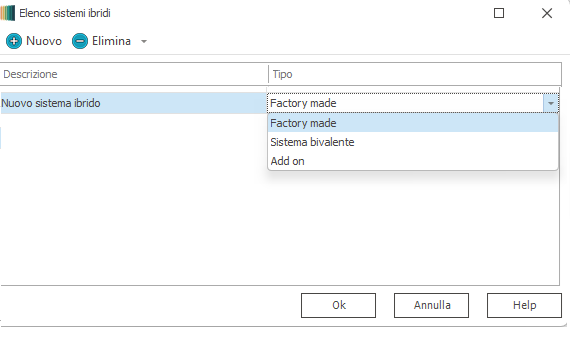 Dopo aver inserito i generatori occorre compilare i dati per il calcolo delle prestazioni nella scheda posta sulla destra della maschera. I dati sono i seguenti: 1. Descrizione: riporta la descrizione associata al componente 2. Tipo: mostra la categoria di appartenenza del generatore 3. Modello: mostra la descrizione del componente cosi come inserito nel relativo database 4. Sistema ibrido: permette l'identificazione in termini di sistema ibrido di due generatori operanti in serie/parallelo sullo stesso impianto termico. E' possibile distinguere le seguenti tipologie: 1) Factory Made, 2) Sistema bivalente, 3) Add on corrispondenti alle definizioni richiamate dai dispositivi normativi che disciplinano gli incentivi fiscali per interventi di efficientamento energetico (Ecobonus, Superbonus, Conto termico). I sistemi ibridi sono composti da una pompa di calore elettrica normalmente aria-acqua o acqua-acqua e da una caldaia a condensazione che funge da backup. Esistono sistemi compatti cioè dei veri e propri generatori monoblocco unici, dei sistemi preassemblati e dei sistemi costruiti in loco mettendo in serie la PdC e la caldaia. Per dare la massima flessibilità all’utente, l’implementazione si comporta come se i sistemi fossero tutti assemblati in loco quindi una volta inserito i due generatori nei dati estesi di ognuno è possibile definire il sistema ibrido ed assegnarlo ad ognuno dei due generatori che lo compongono. A livello di calcolo non cambia nulla in quanto i due generatori risultano sempre collegati dal collettore o dal serbatoio nel quale confluiscono. La funzionalità ha quindi il solo valore di rappresentare il sistema ibrido nella scheda degli incentivi fiscali, per consentire una più agevole compilazione della relativa scheda sui portali GSE ed ENEA.
