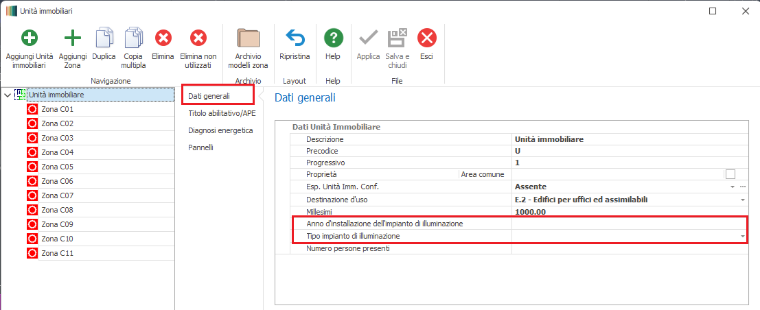 A livello di unità immobiliare, i parametri da specificare sono collocati nelle schede "Dati generali" e "Titolo abilitativo/APE":