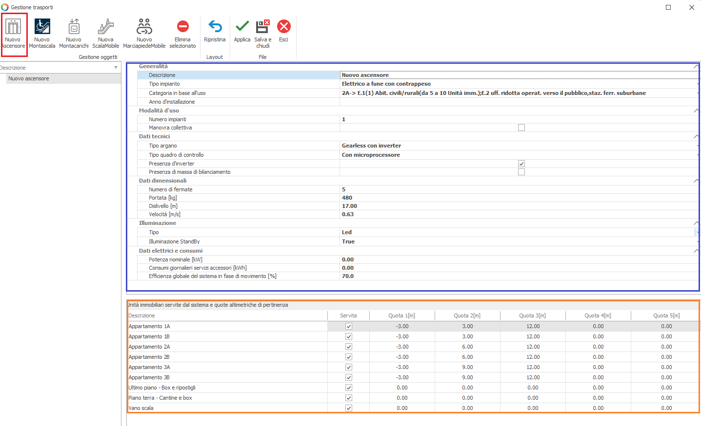 ascensore occorre cliccare sul pulsante "Nuovo