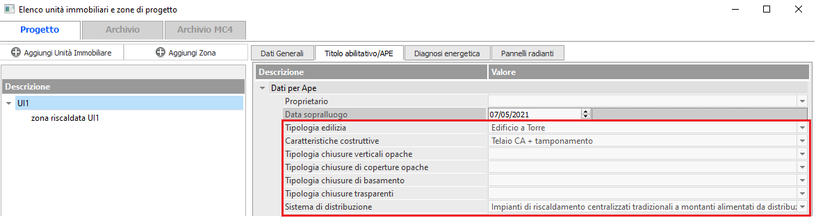 unità immobiliari e zone di progetto") è necessario valorizzare