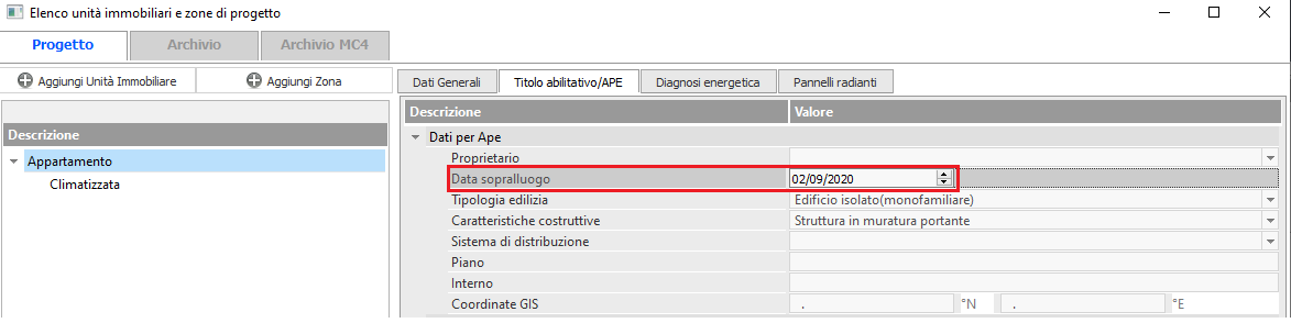 nella scheda "Titolo abilitativo \ APE" dell'unità