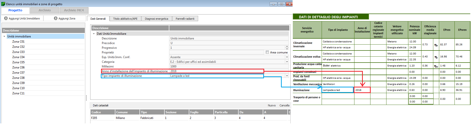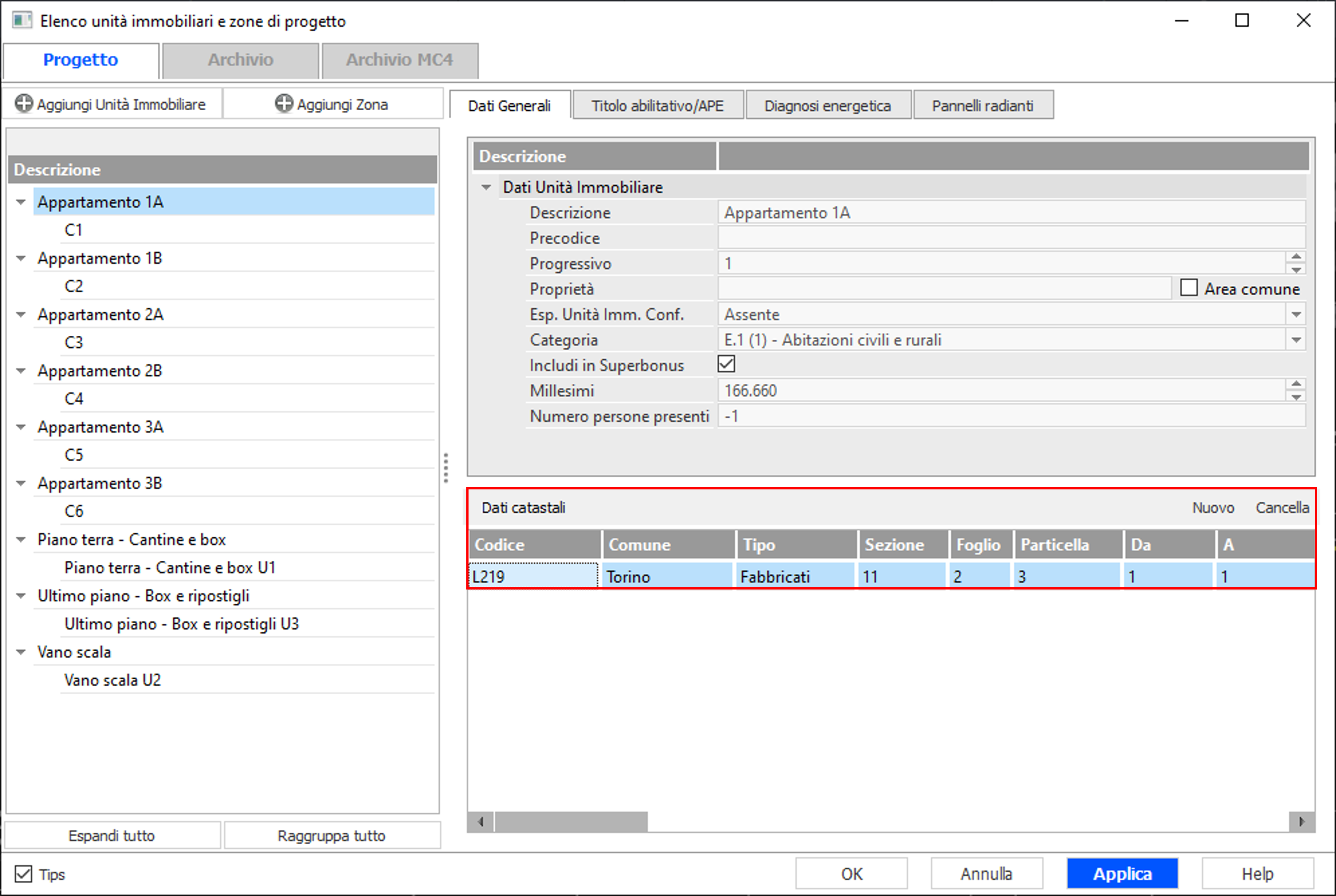 scheda Dati Generali dell'unità immobiliare ( "Elenco unità immobiliari e zone