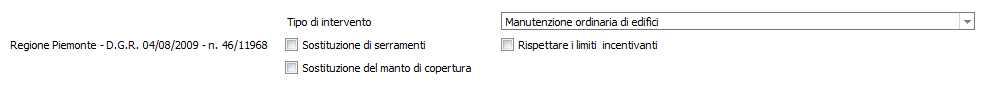 In corrispondenza della voce Intervento Piemonte vengono elencate le opzioni strettamente connesse alla normativa regionale attualmente vigente (Regione Piemonte – Piano Stralcio – D.G.R. 04/08/2009 – n.46/11968).