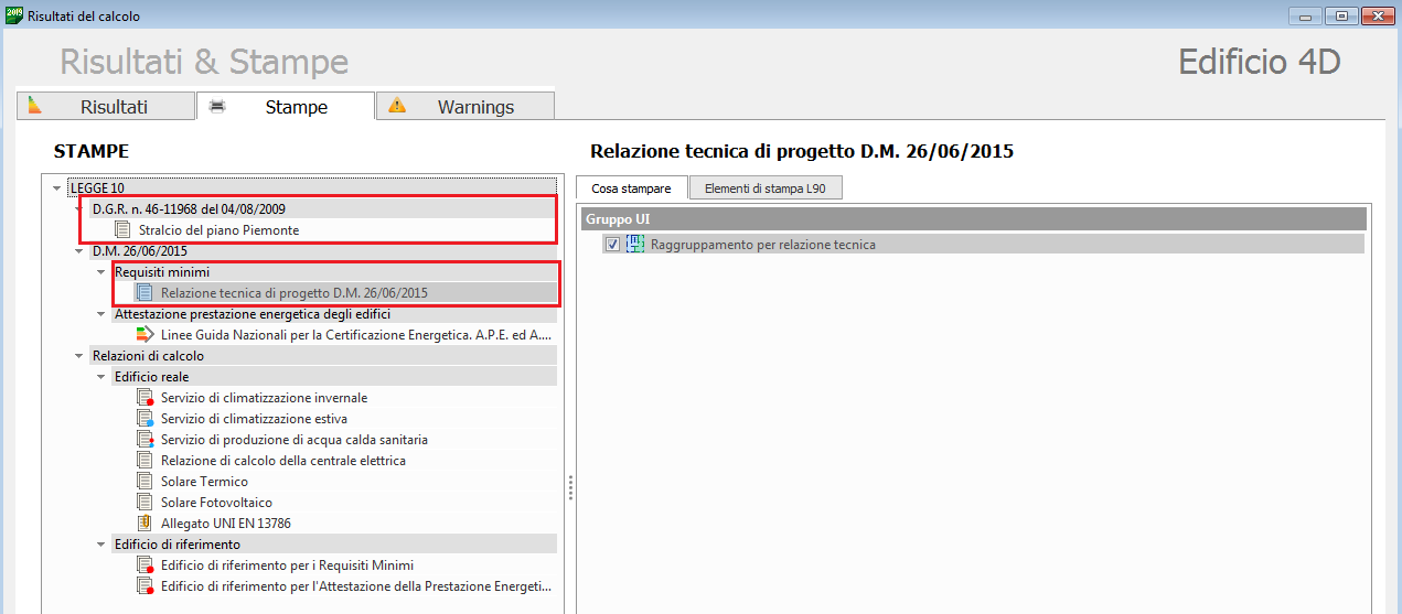 A livello di output di stampa, il software produrrà due relazioni tecniche distinte, una in conformità con il piano Stralcio regionale ed una in conformità con il Decreto Requisiti Minimi.