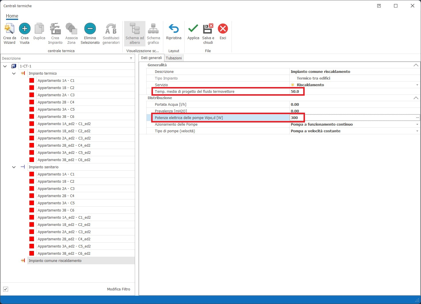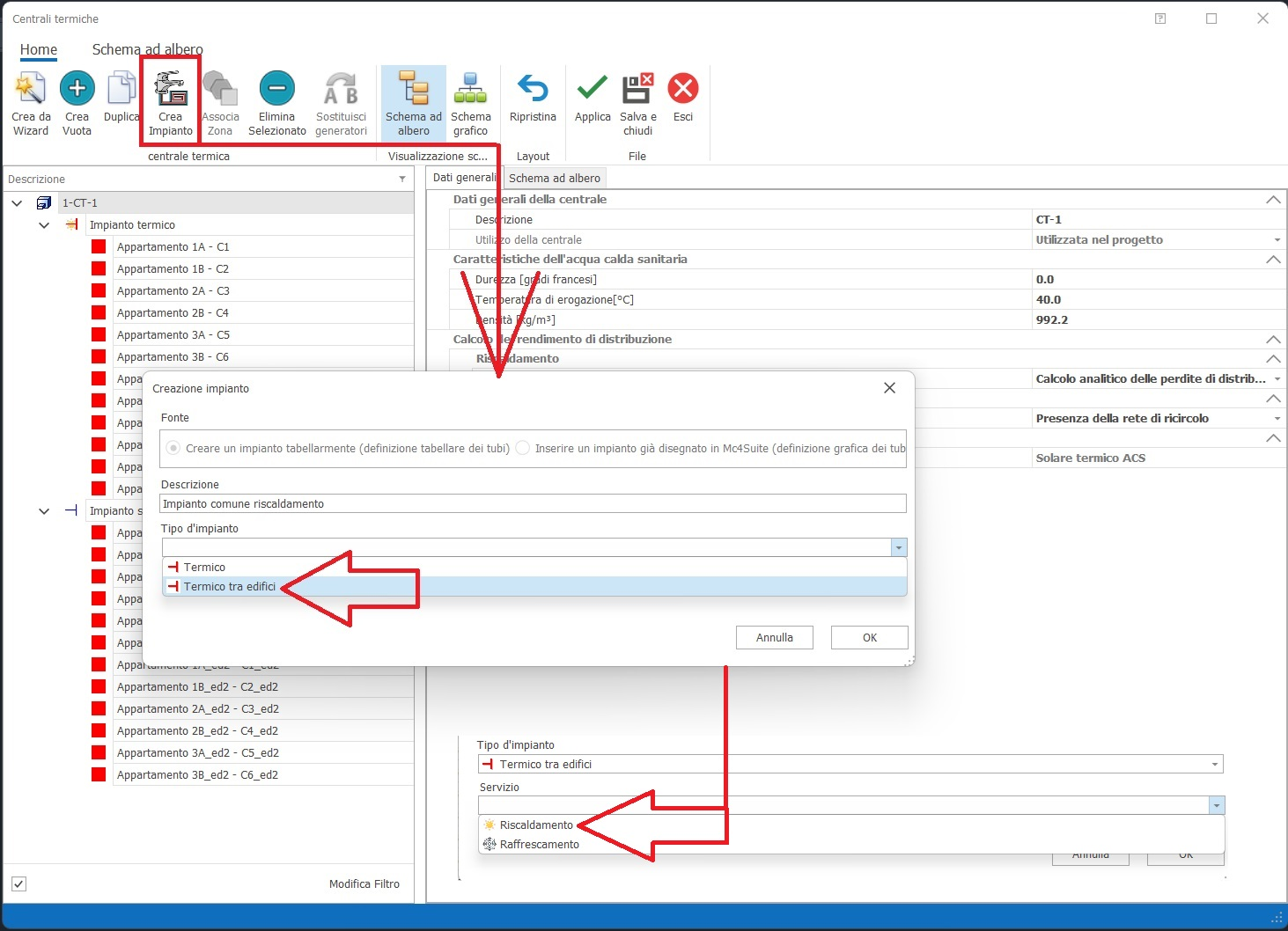 il menu di creazione degli impianti termici; oltre alla descrizione