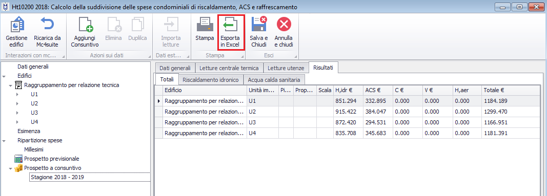 calcolo; a tal fine occorre cliccare sul pulsante "Esporta in Excel"