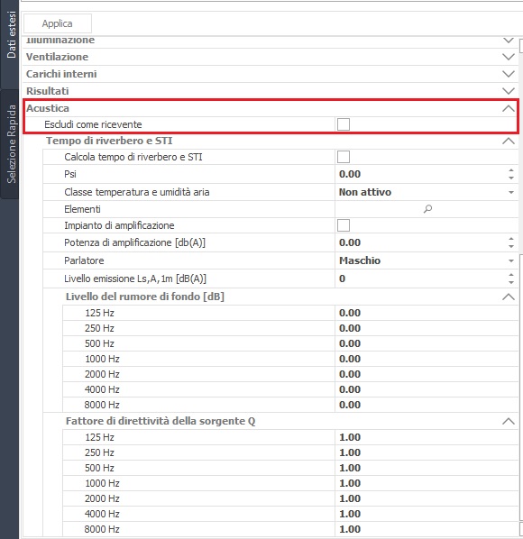 dell’ambiente in esame, selezionare la scheda Acustica e porre