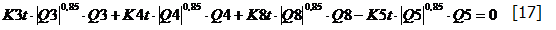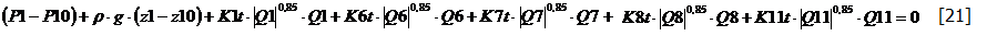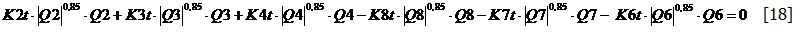 Le equazioni [17], [18], [19], [20], [21] si vanno ad aggiungere alle equazioni [7], [8], [9], [10], [11], [12], per formare un sistema non-lineare di 11 equazioni nelle 11 incognite di portata. Tale sistema può essere risolto con uno dei metodi numerici di risoluzione dei sistemi non-lineari. Nel caso specifico, le soluzioni al sistema di equazioni della rete sono le seguenti: