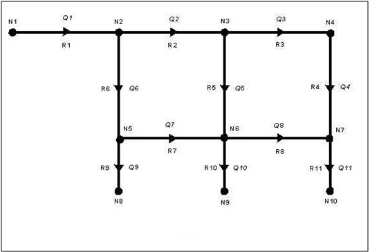 Si scrivono innanzitutto le equazioni di conservazione della massa ai nodi della rete. Si noti che trattandosi di acqua, cioè di fluido incomprimibile, le equazioni di conservazione della massa possono essere scritte in termini di portate volumetriche Qi: