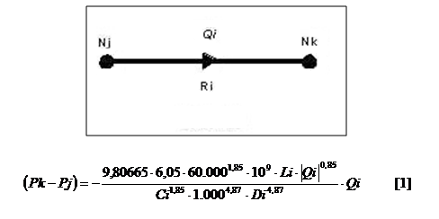Il generico ramo R i di rete, associato ad una tubazione percorsa da acqua è caratterizzato dalla formula di Hazen-Williams (vedi immagine sottostante):