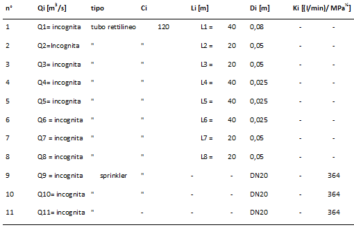 Il ramo Ri associato allo sprinkler è caratterizzato dall'equazione essendo Ki il coefficiente di efflusso dello sprinkler [(l/min)/MPa ½ ].