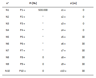La rete si interfaccia con l’esterno nel nodo N1, nel quale si considera applicata la pressione P1 di una generica alimentazione (serbatoio o pompa), e nei nodi N8, N9, N10, nei quali si considera applicata la pressione atmosferica (P8 = P9 = P10 = 0 Pa). Ciascuno dei nodi della rete è caratterizzato da una quota z [m], rispetto ad un riferimento comune.