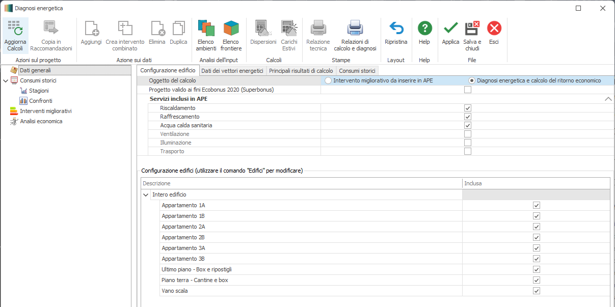 Optando per l'oggetto di calcolo "Diagnosi energetica e calcolo del ritorno economico" , la sezione Configurazione Edificio si arricchisce di due elementi ovvero: - il checkbox Progetto valido ai fini Ecobonus 2020 (Superbonus), il quale predispone il menu alla produzione dell' Attestato di Prestazione Energetica "Convenzionale" e della relativa Asseverazione secondo quanto disciplinato dalla Legge n.77 del 17/07/2020 e dal D.M. del 06/08/2020. - la sezione "Servizi inclusi in APE", che elenca i servizi in base dei quali verrà eseguita la valutazione energetica dell'immobile ( ovvero i soli servizi presenti nello stato "ante operam").