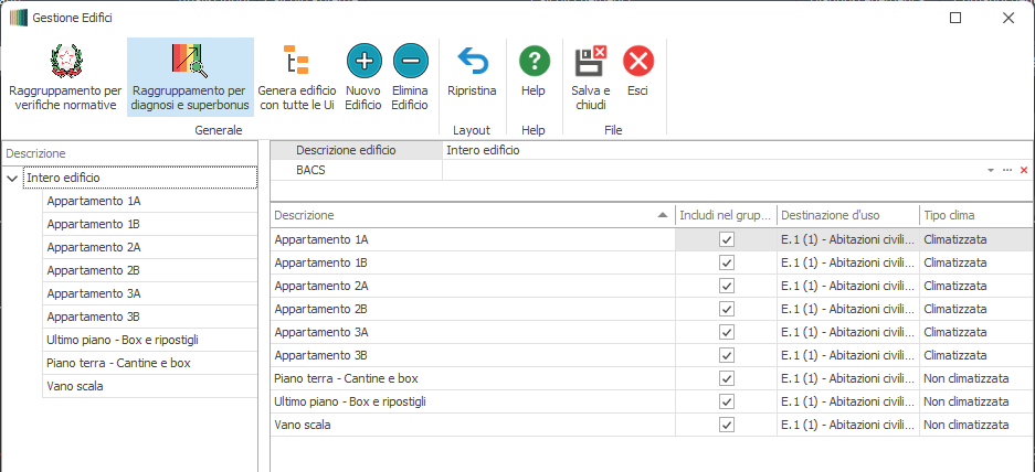 Rispondendo affermativamente, verrà attivato il menu "Configurazione edifici", nell'ambito del quale occorrerà posizionarsi nella sezione "Raggruppamento per diagnosi e superbonus" in cui si potrà accettare la configurazione proposta (in sostanza una copia esatta del raggruppamento eseguito per le verifiche normative) oppure crearne una ad hoc.