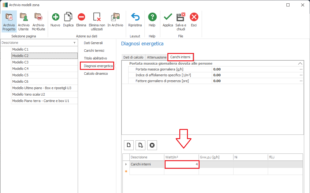Per inserire i valori mancanti occorre posizionarsi nell'ambito dell'"Archivio Modelli di Zona" del menu "Unità immobiliari", quindi consultare la sezione dedicata alla "Diagnosi energetica", scheda "Carichi interni".