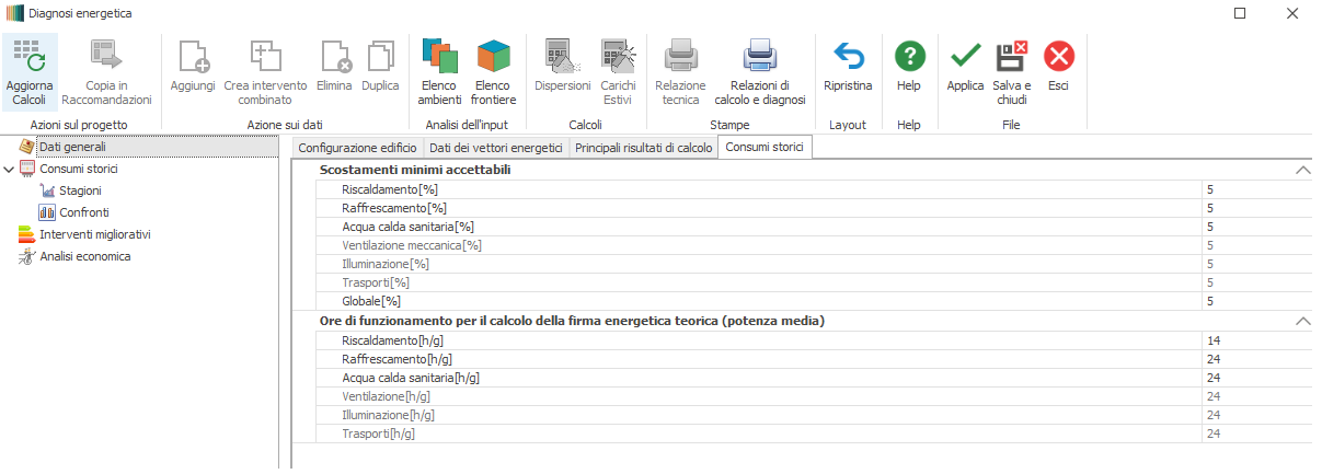 La pagina permette di impostare lo scostamento accettabile nel confronto tra consumi reali e consumi calcolati ed il numero di ore di funzionamento dei singoli servizi ai fini del calcolo della firma energetica teorica.