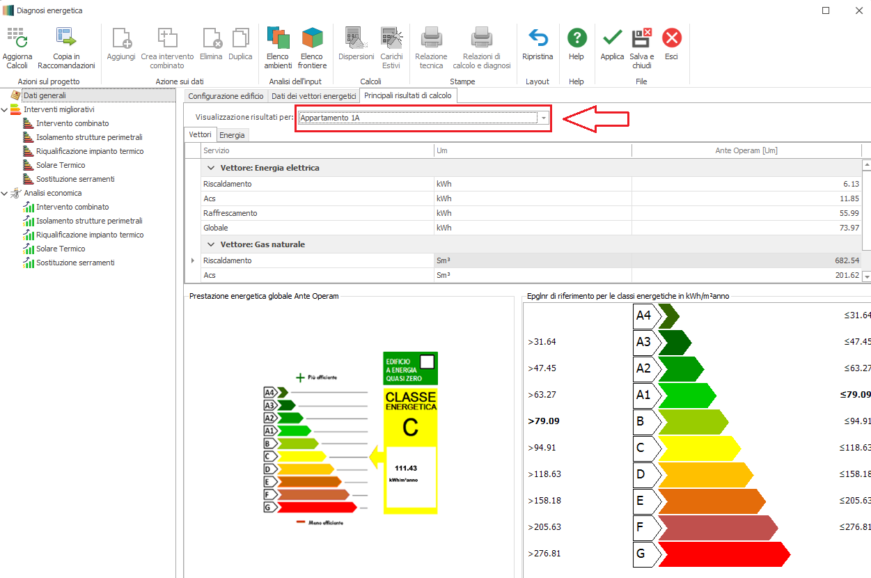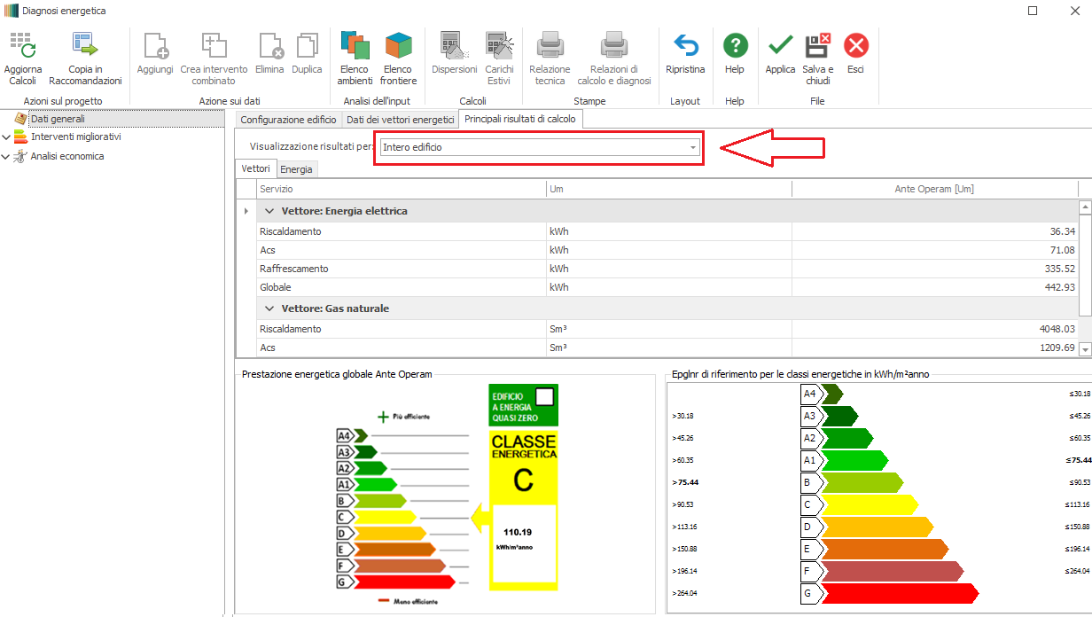 Per ogni vettore e per ogni servizio vengono visualizzati i risultati di calcolo dell’ elemento indicato nel box "Visualizzazione risultati per". La prima voce disponibile è "Intero edificio"; se l'edificio è costituito da una molteplicità di unità immobiliari, nello stesso box vengono elencate anche le singole unità presenti nell'edificio. Nella parte inferiore viene presentata la classificazione energetica dell'intero edificio (o della singola unità immobiliare) e la targa energetica con l'indicazione dei limiti dell'indicatore per la suddivisone in classi energetiche.