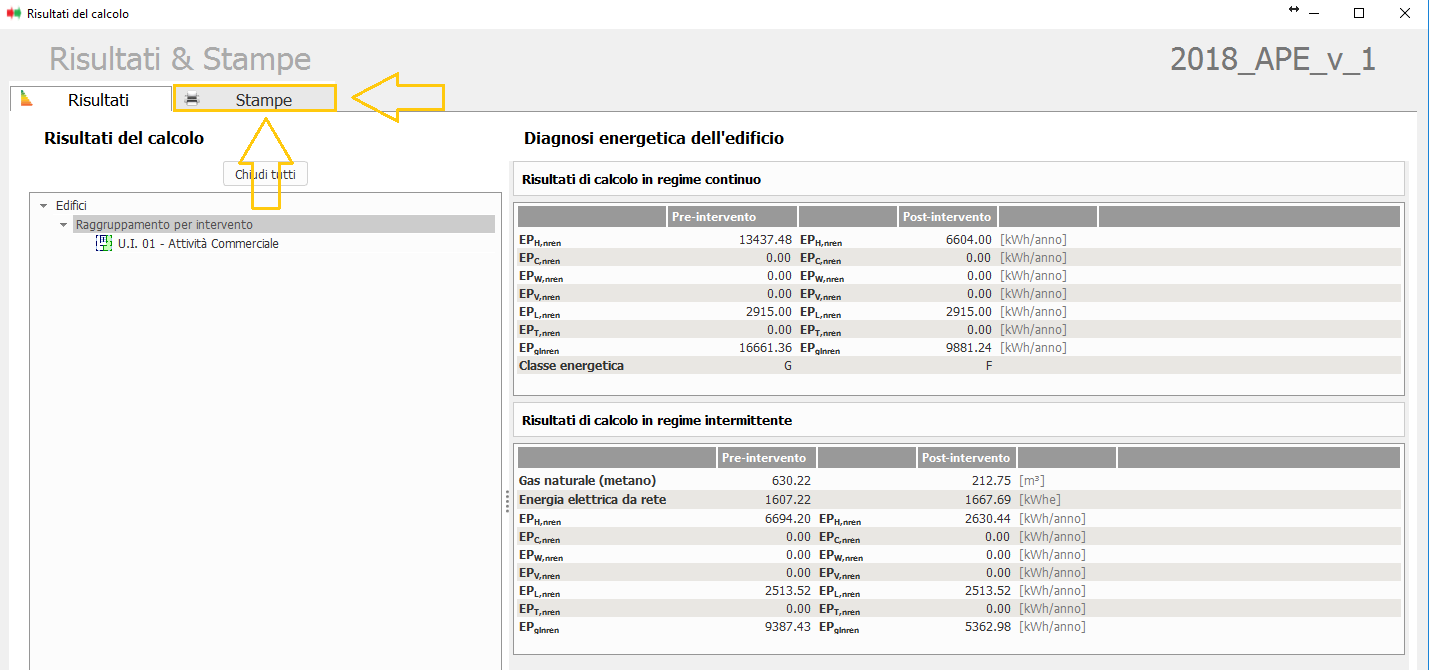 Si attiverà innanzitutto la maschera dei risultati di calcolo, in cui vengono riepilogati i risultati in termini di fabbisogni annuali e consumo di combustibile, sia in regime continuo che in regime intermittente, tanto per la situazione ante intervento che per quella post intervento.