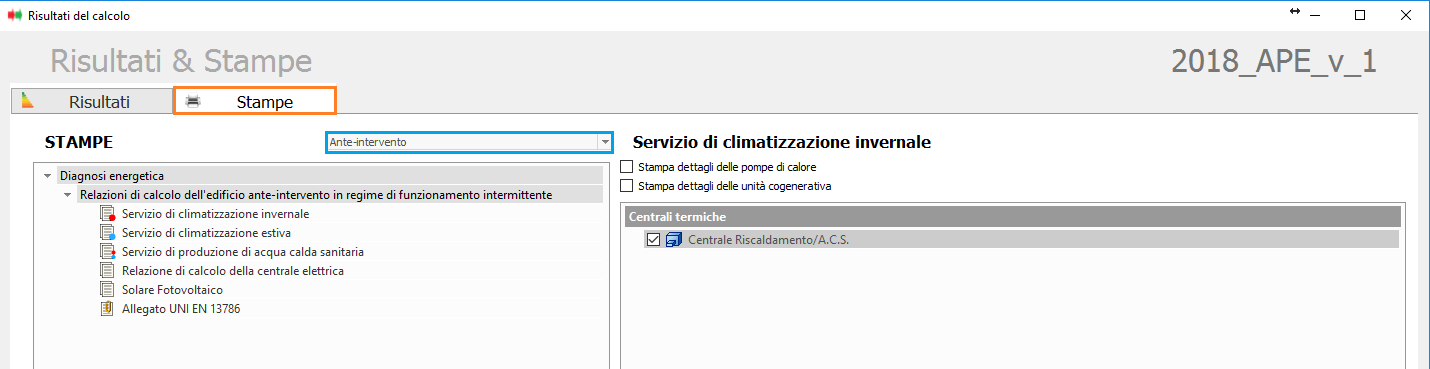 Nel menù a tendina posto superiormente (evidenziato in azzurro nell'immagine soprastante) si potrà specificare se la stampa è da riferire all'edificio nel suo stato attuale (Ante intervento) o a quello corrispondente all'intervento migliorativo ipotizzato (Post intervento).