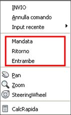 esegue il comando di calcolo A comando attivo, il programma chiede , da riga di comando, a seconda dell’input eseguito, se selezionare un tronco del circuito di mandata, di ritorno o entrambe; in alternativa è possibile cliccare con il tasto destro del mouse e scegliere, nel menù contestuale, quale modalità di calcolo attivare tra Mandata, Ritorno od Entrambe. Le opzioni presenti saranno solo quelle relative al tipo di input eseguito: ad esempio, in caso di disegno della sola rete di mandata sarà presente solo l'opzione di calcolo per la rete di mandata. Il tronco selezionato potrà corrispondere all’origine della rete, nel qual caso verrà analizzato l’intero circuito, oppure potrà essere un qualsiasi altro tronco preventivamente staccato dalla rete principale : in tal caso verrà analizzata solo una porzione della rete complessiva. ATTENZIONE: Affinché il calcolo vada a buon fine è necessario che su ogni punto estremo di tronco da dimensionare sia collocato un terminale. Se ciò non si verifica, prima di iniziare l’elaborazione del calcolo il programma mostra il messaggio “Attenzione: Collegare i terminali”. Nella parte superiore della maschera sono presenti le opzioni che corrispondono al tipo di calcolo che l’utente desidera venga effettuato sulla rete ovvero : Predimensionamento