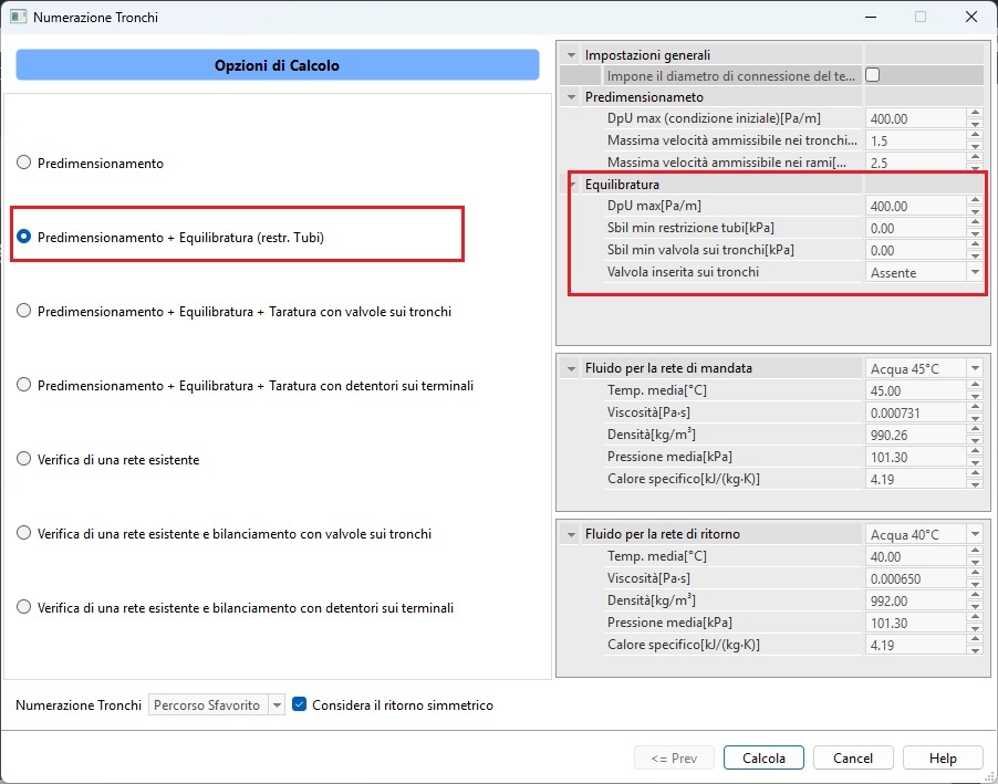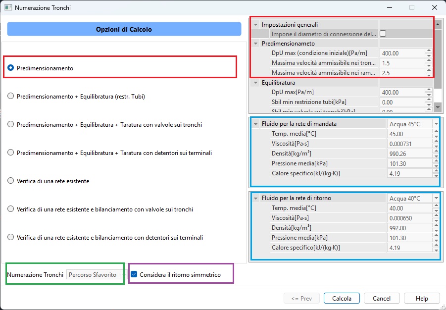 Si tratta di un dimensionamento a perdita di carico costante; il programma calcola il diametro secondo la massima perdita ammessa dall’utente per metro lineare di tubo, impostata nella sezione Predimensionamento in corrispondenza del campo DpU max [Pa/m] , secondo la Massima velocità ammissibile nei tronchi [m/s] e la Massima velocità ammissibile nei rami [m/s]. Entrambi i campi sono ovviamente modificabili (in fig. 4.2 DpU max = 100 Pa/m, Massima velocità ammissibile nei tronchi = 1 m/s, Massima velocità ammissibile nei rami = 2 m/s). Nelle sezioni Fluido per la rete di mandata e fluido per la rete di ritorno, nell’apposito box corredato di menù di scelta , è possibile scegliere ed associare il fluido termovettore da considerare nel calcolo, rispettivamente per la rete di mandata e per la rete di ritorno.