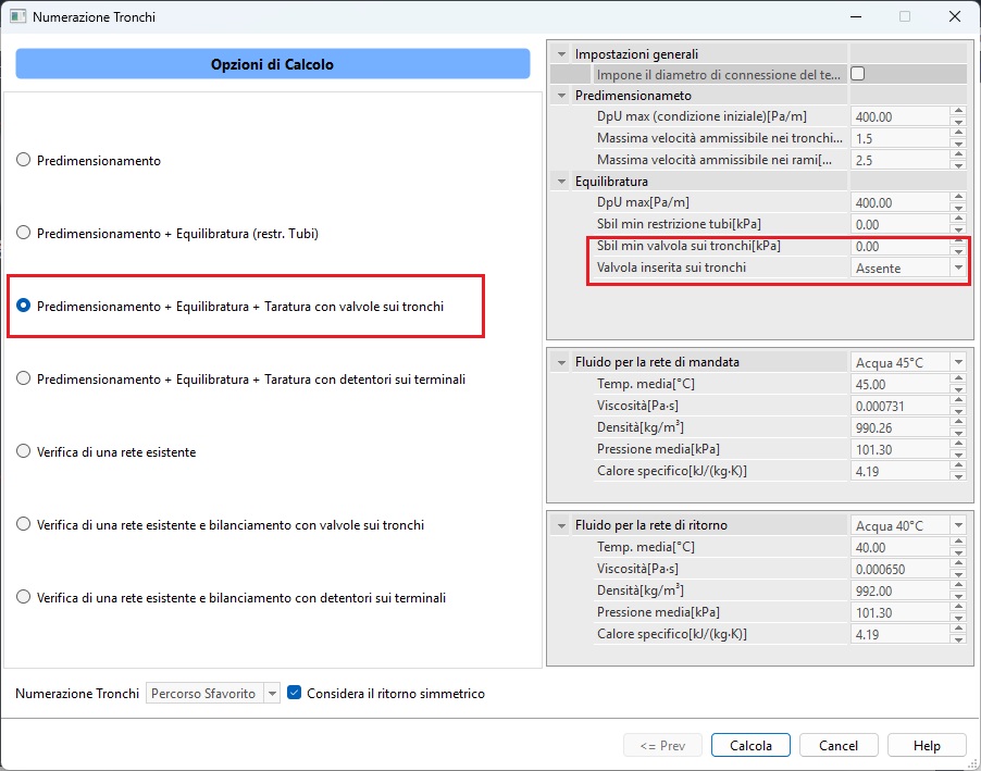 Verifica di una rete e bilanciamento con valvole sui tronchiEsattamente come al punto precedente ma verranno calcolate le posizioni dei detentori già inseriti sui terminali.