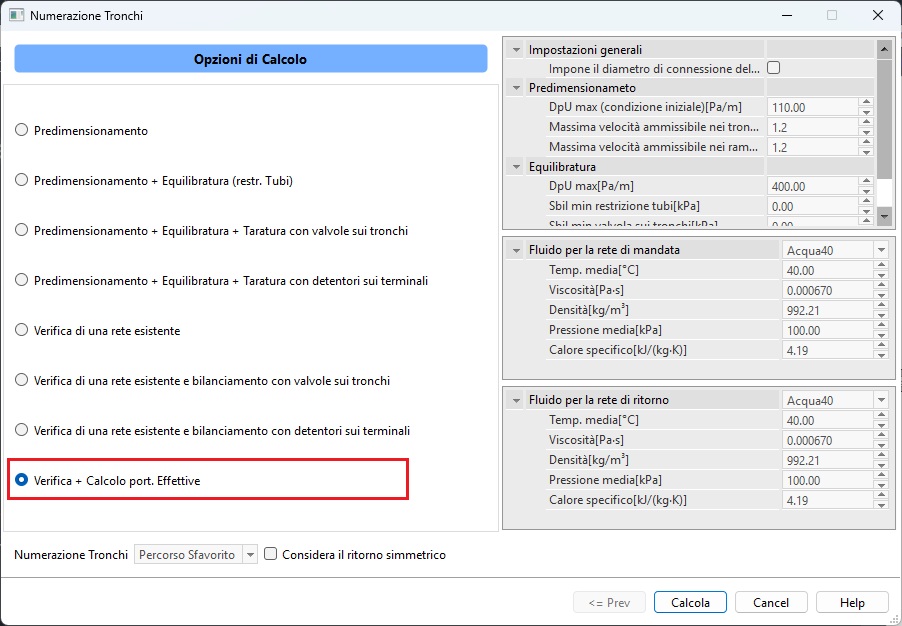 Il programma calcola la portata e la perdita totale senza modificare il diametro delle tubazioni.