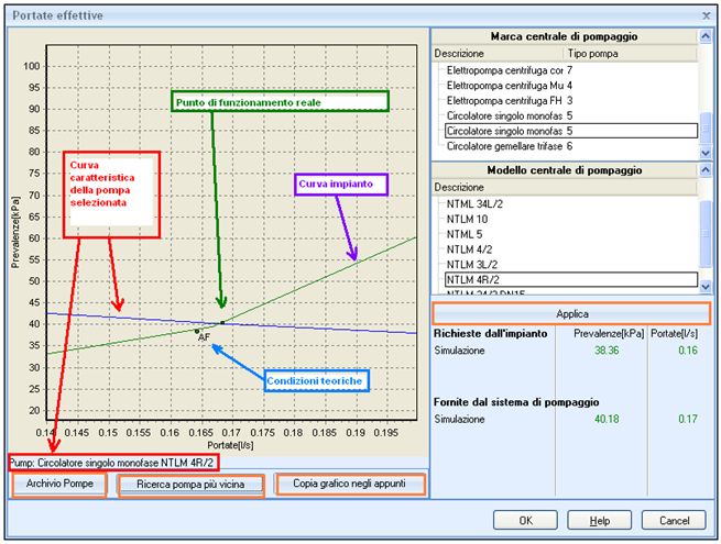 In questa maschera è riportata la curva dell’impianto e della pompa di circolazione ed una serie di pulsanti ovvero: