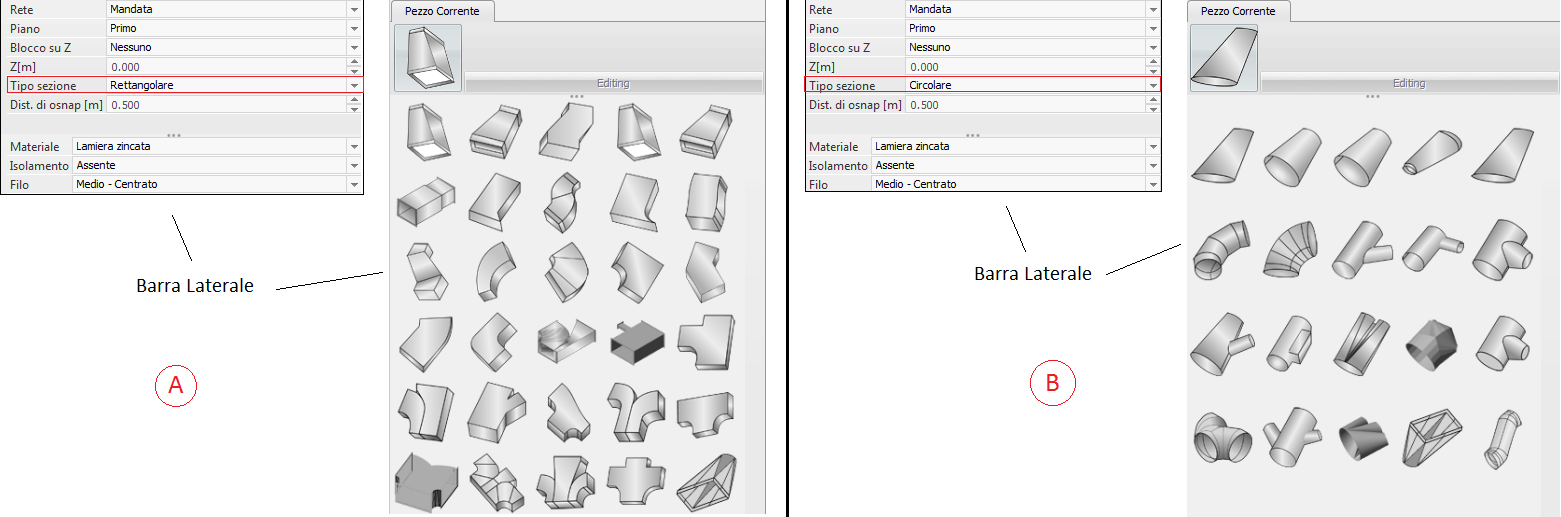 Nella barra laterale si distinguono due parti: la parte in alto dove si impostano i dati relativi alla rete di appartenenza, la quota di disegno ed il materiale e la parte in basso dove invece si seleziona il tipo di adattatore. La figura qui sopra mostra la barra laterale dopo aver eseguio il comando nei casi di sezioni rettangolari (A) e circolari (B).