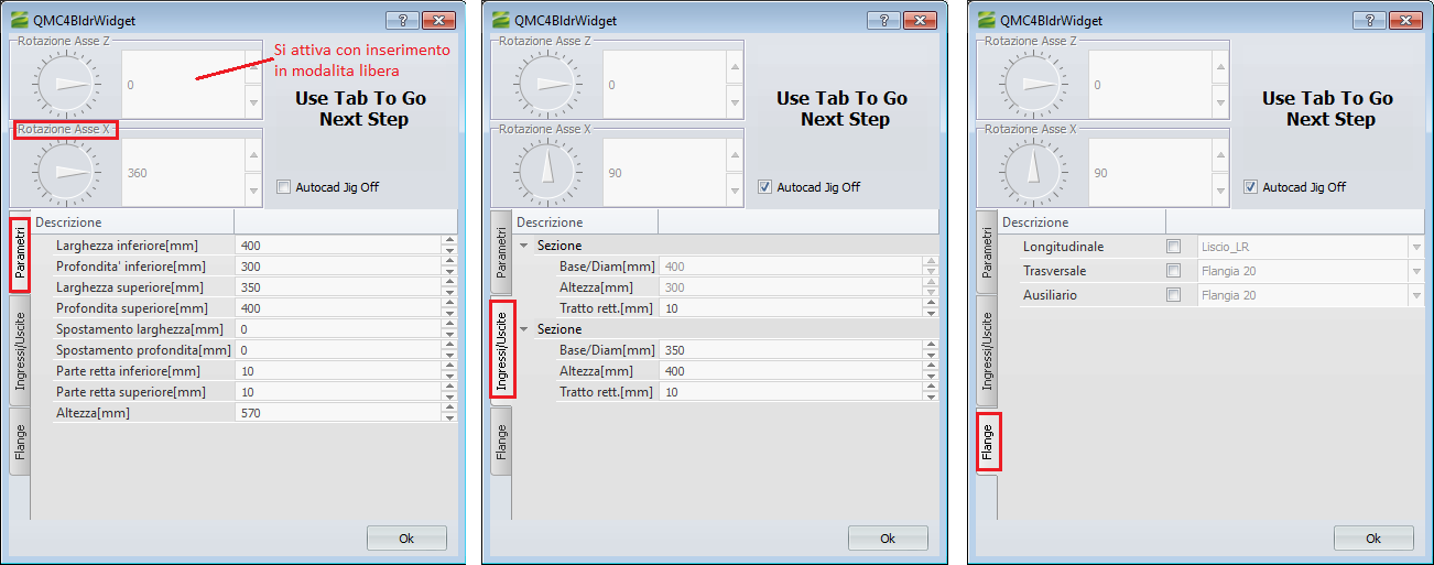 Fissato l'angolo di rotazione si può passare ad impostare i dati presenti nelle diverse schede.