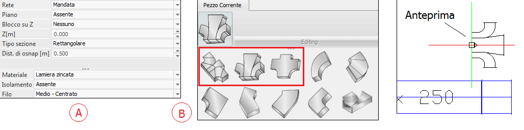 Nella barra laterale si distinguono due parti: la parte in alto dove si impostano i dati relativi alla rete di appartenenza, la quota di disegno ed il materiale e la parte in basso dove invece si seleziona il tipo di adattatore. La figura qui sopra mostra la barra laterale dopo aver eseguio il comando nel caso di sezione rettangolare.