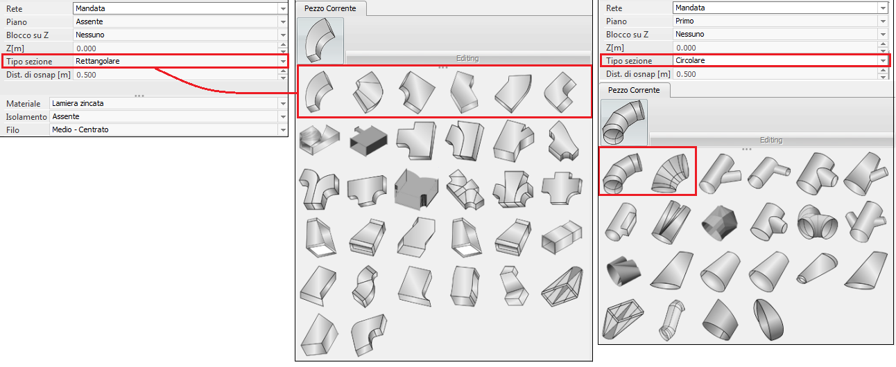 Nella barra laterale si distinguono due parti: la parte in alto dove si impostano i dati relativi alla rete di appartenenza, la quota di disegno ed il materiale e la parte in basso dove invece si seleziona il tipo di Curva. La figura qui sopra mostra la barra laterale dopo aver eseguio il comando nel caso di sezione rettangolare e nel caso di sezione circolare.