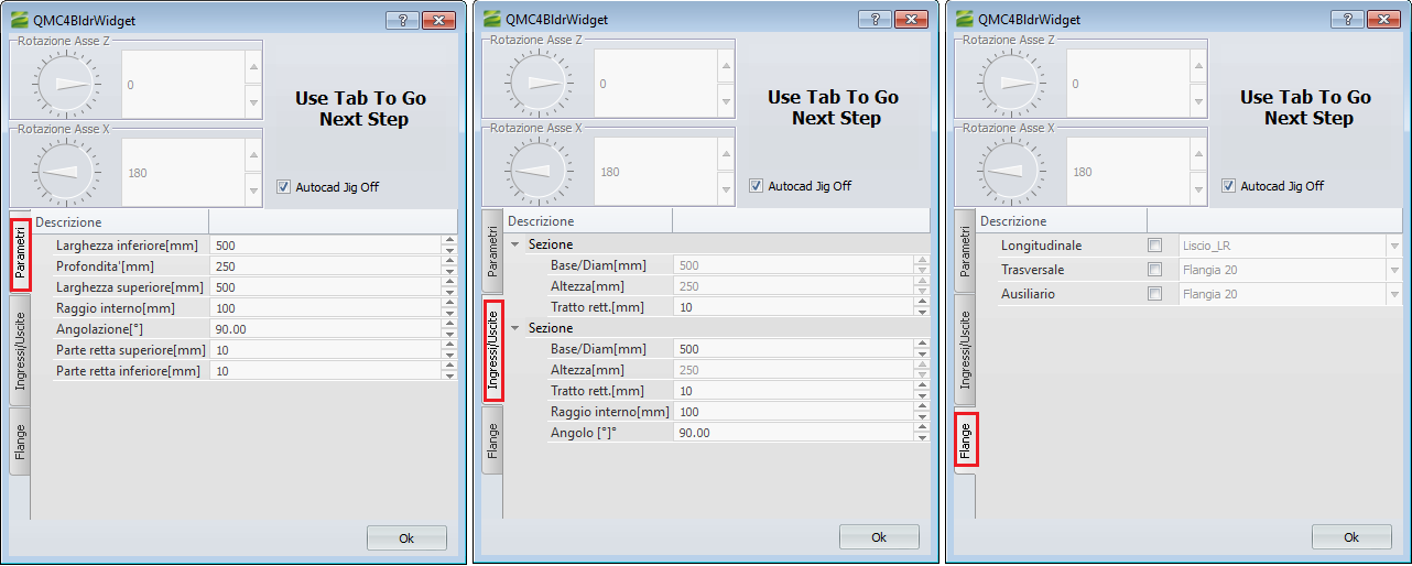 La scheda Ingressi/Uscite contiene le dimensioni delle sezioni di ingresso ed uscita, la Lunghezza dei tratti rettilinei per entrambe le sezioni e l’angolo totale della curva. Inoltre, in base alla tipologia di curva sarà possibile impostare il raggio di curvatura interno e/o esterno.