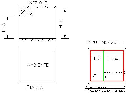 La parte sulla sinistra è alta 3m ed ha come solaio una struttura di spessore maggiore di 1m rispetto la parte di destra che è alta 4m. Per eseguire l’input con Mc4Suite occorre, in corrispondenza del cambio di altezza, disegnare una parete (come tipo di struttura se ne può usare una qualsiasi e comunque con spessore non inferiore ad 1cm) che verrà eliminata dalla vista tridimensionale quando si inserirà l’ambiente aggregato. Tutte le proprietà dell’ambiente aggregato sono associate all’ambiente principale, cioè quello al quale si aggrega. A riprova di quanto detto ora, se si effettua un input come quello riportato in figura, nell’elenco degli ambienti, cosi come nelle relazioni, verrà elencato soltanto l’ambiente “1001 Ufficio”. Pertanto nella parte sinistra si inserisce l'ambiente con altezza forzata a 3m e solaio con spessore maggiore (si puo usare indipendentemente ambiente "standard" o Ambiente Aggregato tenedo conto che l'ambiente aggregato si può inserire solo dopo aver inserito l'ambiente principale) mentre a destra si inserisce l'ambiente ad altezza 4m con solaio mdi spessore inferiore. Qualora l'ambiente più alto sfori nel piano successivo occorre comunque rispettare le regole di cui al paragrafo "Ambienti con solai sfalsati"
