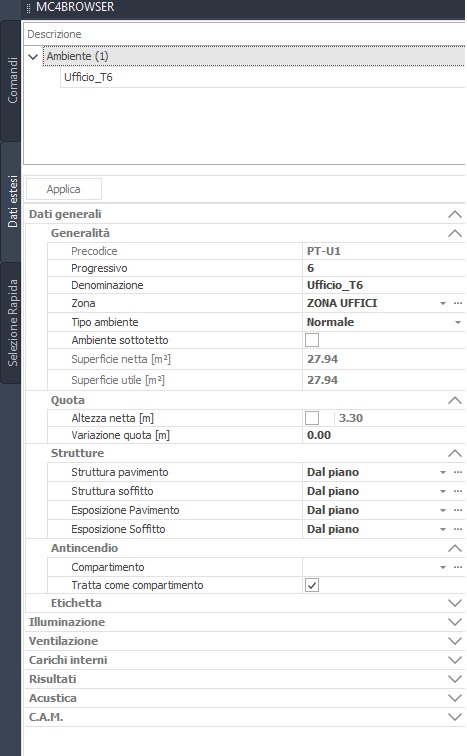 StruttureStruttura pavimento: riepiloga la struttura assegnata come pavimento del locale. Struttura Soffitto: riepiloga la struttura assegnata come soffitto del locale. Esposizione Soffitto: permette di assegnare un esposizione termica alla stratigrafia adottata come soffitto del locale. Esposizione pavimento: permette di assegnare un esposizione termica alla stratigrafia adottata come pavimento del locale. EtichettaLayout : permette di associare un modello per l'etichetta ambiente in modo da personalizzarne l'aspetto grafico ed il contenuto; tramite apposito menù a tendina si accede all'Archivio Etichette in cui oltre alla possibilità di modificare l'etichetta di default , è possibile creare layout personalizzati. Etichetta fissata : l'opzione permette di bloccare la posizione dell'etichetta nell'ambito dell'input grafico.