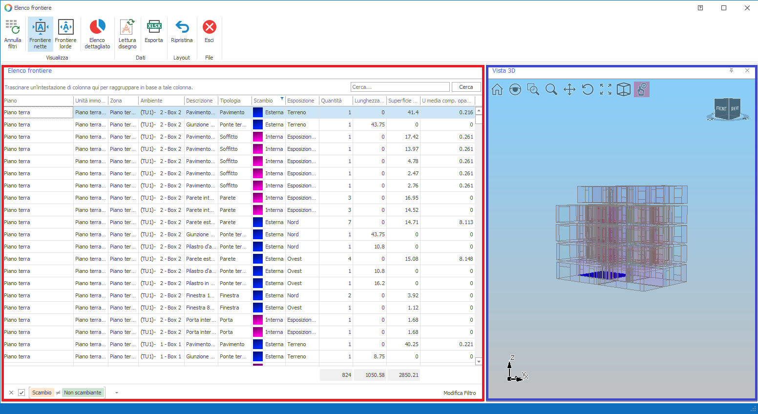 il valore di trasmittanza media riportato nell'ambito dell"Elenco frontiere" per ciascun elemento opaco è un dato puramente indicativo e non ha rilevanza ai fini normativi; esso viene calcolato secondo gli stessi criteri con cui viene stimato il valore per l'intera categoria di strutture di appartenenza ma in relazione ad una porzione molto più limitata dell'involucro. Valori anche molto elevati di questo parametro che si possono riscontrare localmente sono l'effetto, tipicamente, della delimitazione dell'analisi ad una porzione di superficie lorda molto piccola, in taluni casi inferiori all'unità. La presenza di questo indicatore nel dettaglio delle frontiere assume pertanto l'esclusiva finalità di individuare le possibili criticità nella distribuzione del valore di trasmittanza media dovute, in genere, alla presenza di una molteplicità di ponti termici. A parità di stratigrafia e di ponti termici, le "perturbazioni" dovute invece ad un confronto su superfici lorde molto diverse tra loro non sono significative ai fini della verifica complessiva di tale parametro. |