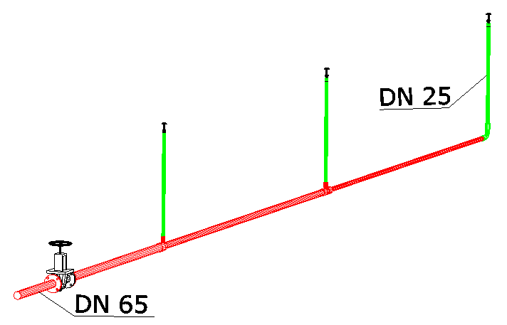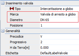 Nel campo Marca occorre selezionare la marca di valvola da inserire e nel campo Diametro la dimensione della valvola stessa (per ogni marca si possono introdurre più dimensioni di valvola (vedi Archivio Valvole). Il campo Posizione contiene la scelta della posizione di chiusura della valvola. Come si vede nel database delle valvole, ad ogni dimensione è possibile associare più posizioni con i rispettivi valori di Kv per la determinazione della perdita; al momento del disegno occorre specificare , laddove possibile, la posizione di chiusura della valvola in modo che il programma determini la perdita di pressione su di essa. I campi Precodice e Progressivo sono utili alla identificazione del componente nel disegno e nelle relazioni (calcolo, computo) e possono essere impostati dall'utente. I campi sono anche mostrati nell'etichetta della valvola stessa. Il campo H da terra determina l'altezza di posizionamento della valvola in caso di inserimento libero (non su tubazione); nel caso di disegno su tubazione il campo viene ignorato. Per l'inserimento libero sono necessari quattro click per il posizionamento (1° click: posizione, 2° click: rotazione intorno a Z, 3° click: rotazione intorno a Y, 4° click: rotazione introno a X) e due click aggiuntivi per il posizionamento e la rotazione dell'etichetta. Per l'inserimento su tubazione invece la posizione e l'orientamento lungo l'asse della tubazione stessa è automaticamente determinato mentre è possibile ancora impostare la rotazione intorno all'asse della valvola (o tubazione); in questo caso occorrono solo due click per il posizionamento e poi i due click per l'etichetta. Si ricorda che è possibile evitare l'inserimento dell'etichetta premendo <Invio>. In questo caso per attivare in seguito la visualizzazione dell'etichette, la stessa deve essere associata al componente tramite i Dati Estesi del componente stesso. L'immagine sottostante (puramente a titolo di esempio) mostra una valvola inserita su una tubazione che collega tre sprinklers.