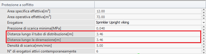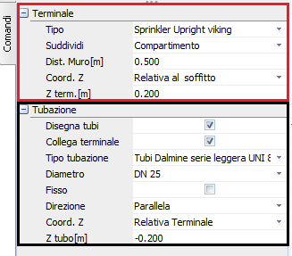 La sezione Tubazione invece contiene informazioni usate per la disposizione delle tubazioni che collegano i vari sprinklers. - Disegna Tubi: si impone al programma il disegno della tubazione. La classe di appartenenza delle tubazioni sarà "distribuzione" - Collega Terminale: il programma disegna il tubo di collegamento (con classe diametri impostata a "Raccordo") tra distribuzione e sprinkler. - Tipo Tubazione: si seleziona il tipo di tubazione da utilizzare - Diametro: impone il diametro della tubazione che sarà disegnata. Il diametro non sarà "fissato" ossia bloccato ma potrà essere modificato dal calcolo di dimensionamento (se non si attiva il check del campo successivo) e comunque sempre manualmente dall'utente; - Fisso: blocca il diametro delle tubazioni. L'utente dovrà agire manualmente per sbloccarlo e far si che venga riattribuito da calcolo di dimensionamento; - Direzione: due le opzioni presenti in questo campo: 1) Parallela e 2) Perpendicolare. Nel primo caso la distribuzione sarà parallela alla parete selezionata (come richiesto dal comando) mentre nel secondo caso la distribuzione sarà perpendicolare alla direzione della parete. - Coord. Z: funziona esattamente come il campo Coord. Z ma il riferimento per la determinazione della quota dei tubi è il terminale e non il soffitto. in alternativa si inserisce la quota assoluta. Questo campo funziona congiuntamente al campo successivo; - Z tubo: se al campo precedente si è selezionato Relativo Terminale occorre inserire un valore negativo per posizionare le tubazioni al di sotto degli sprinkler. Se il valore invece è positivo allora la tubazione sarà al di sopra dello sprinkler che indipendentemente dal sua natura (pendent o upright) sarà installato come Pendent. Una volta impostati i dati nella barra laterale occorre cliccare all'interno dell'ambiente da coprire e poi cliccare su una parete dell'ambiente. In questo caso per essere sicuri di selezionare la linea dell'unifilare della parete si invita a disattivare la vista del tridimensionale dell'edificio e lasciare attivo solo l'unifilare altrimenti il comando potrebbe continuare a chiedere all'utente di selezionare una parete.